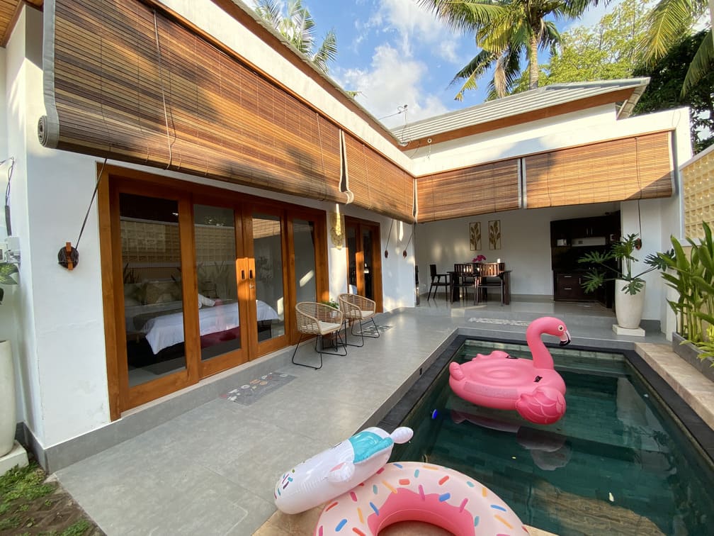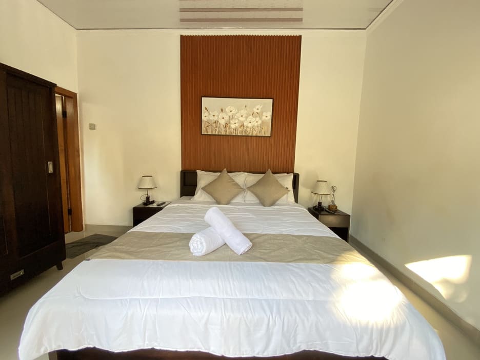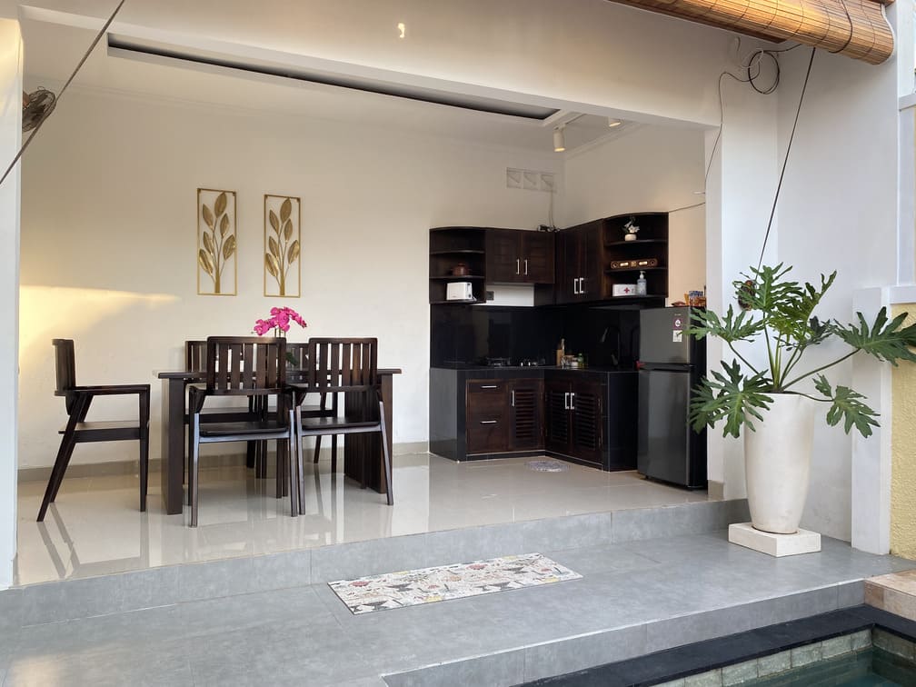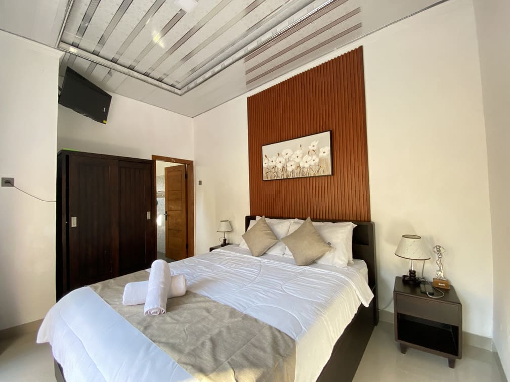 - Fasilitas : AC, 2 Kamar Tidur, 2 Kamar Mandi, Kolam Renang, Dapur, Ruang Makan, Ruang Tamu, Halaman, Area Parkir